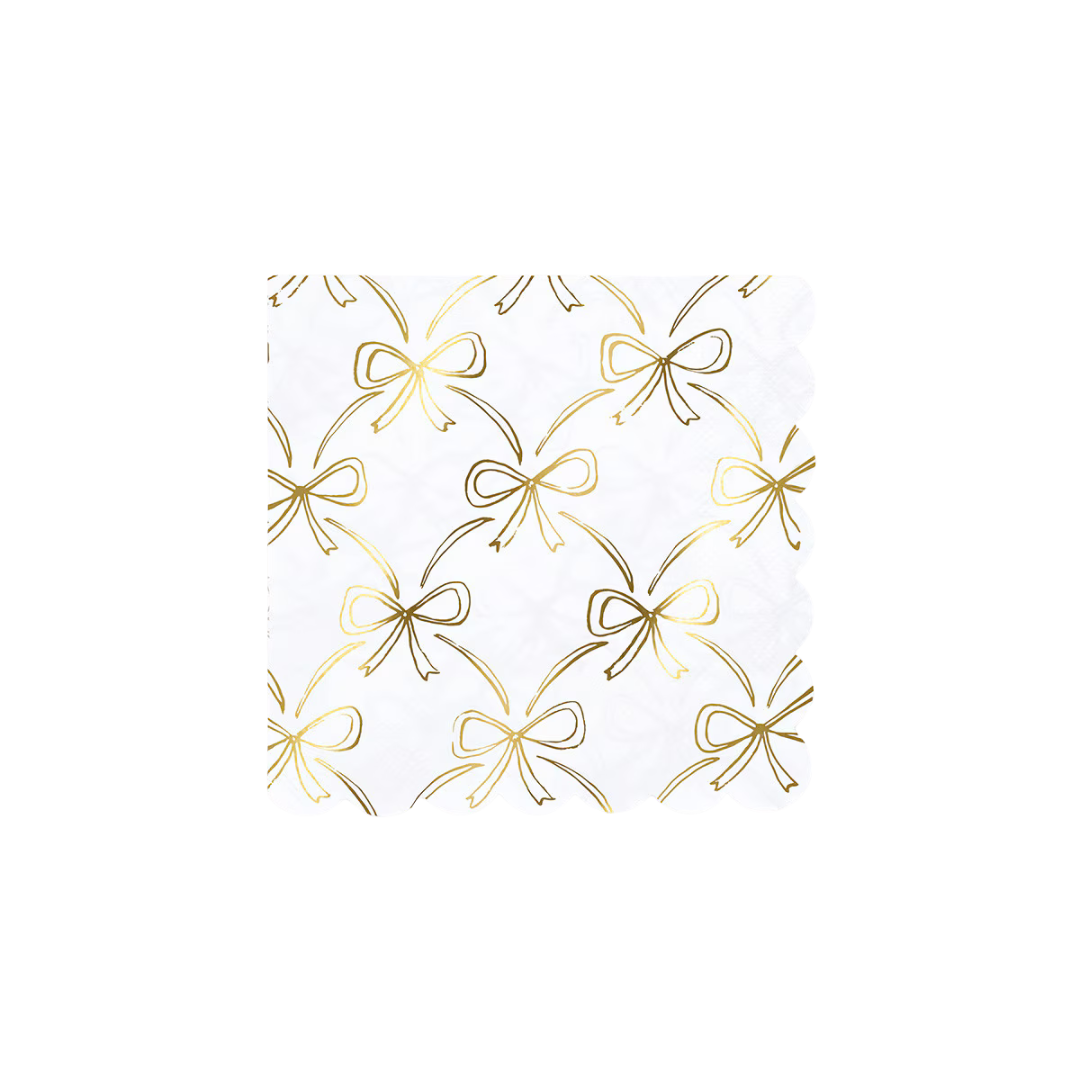 Add flair to your party with these Gold Bow Cocktail Napkins. The combination of golden bows and a scalloped border is guaranteed to bring effortless sophistication to your table, making every setting shine. Disposable napkins have never been this chic and are perfect for the whole family to use.
