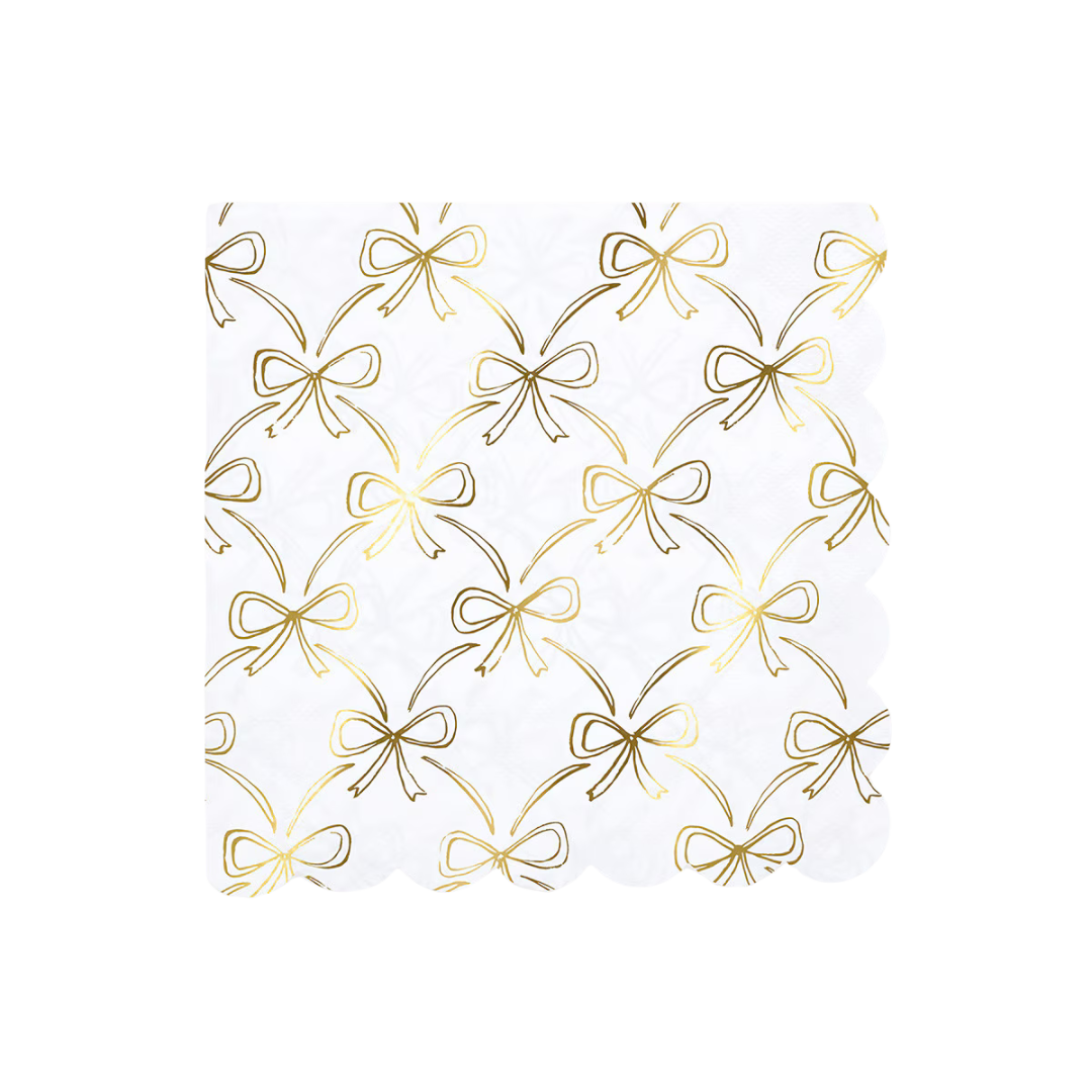 Add flair to your party with these Gold Bow Large Napkins. The combination of golden bows and a scalloped border, is guaranteed to bring effortless sophistication to your table, making every setting shine. Disposable napkins have never been this chic, and are perfect for the whole family to use.