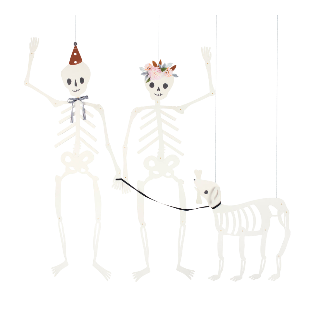 Add a touch of spooky charm to your Halloween setup with these White Giant Jointed Skeletons Hanging Decorations - 3 Pcs! This playful trio includes two life-sized skeletons and one adorable skeleton dog each with delightful details that make them stand out. One skeleton features a party hat and ribbon bow, another wears a floral crown, and the dog comes with a black ribbon leash for extra fun.