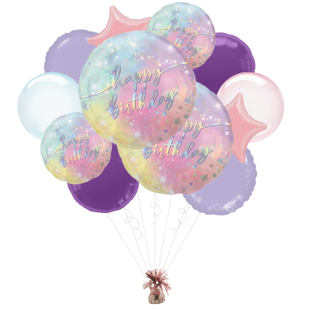 Add a dreamy touch to their celebration with this Luminous Birthday Foil Balloon Bundle! Featuring three round balloons with a soft pastel design and elegant "Happy Birthday" text, paired with two solid lavender balloons, this bundle is perfect for a magical and stylish birthday party.