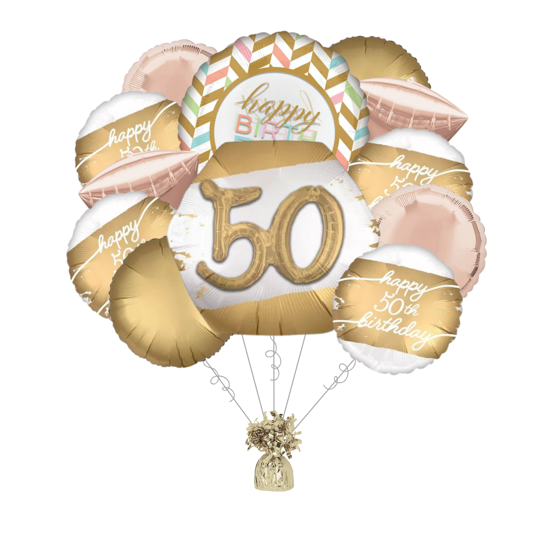 Premium Golden Age 50th Birthday Foil Balloon Bundle with Balloon Weight