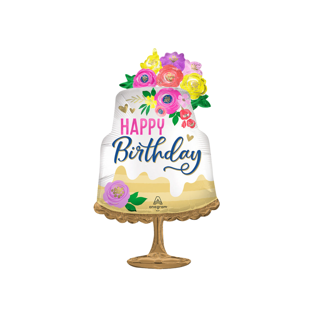 White and Satin Gold Floral Happy Birthday Cake-shaped Foil Balloon, 25in