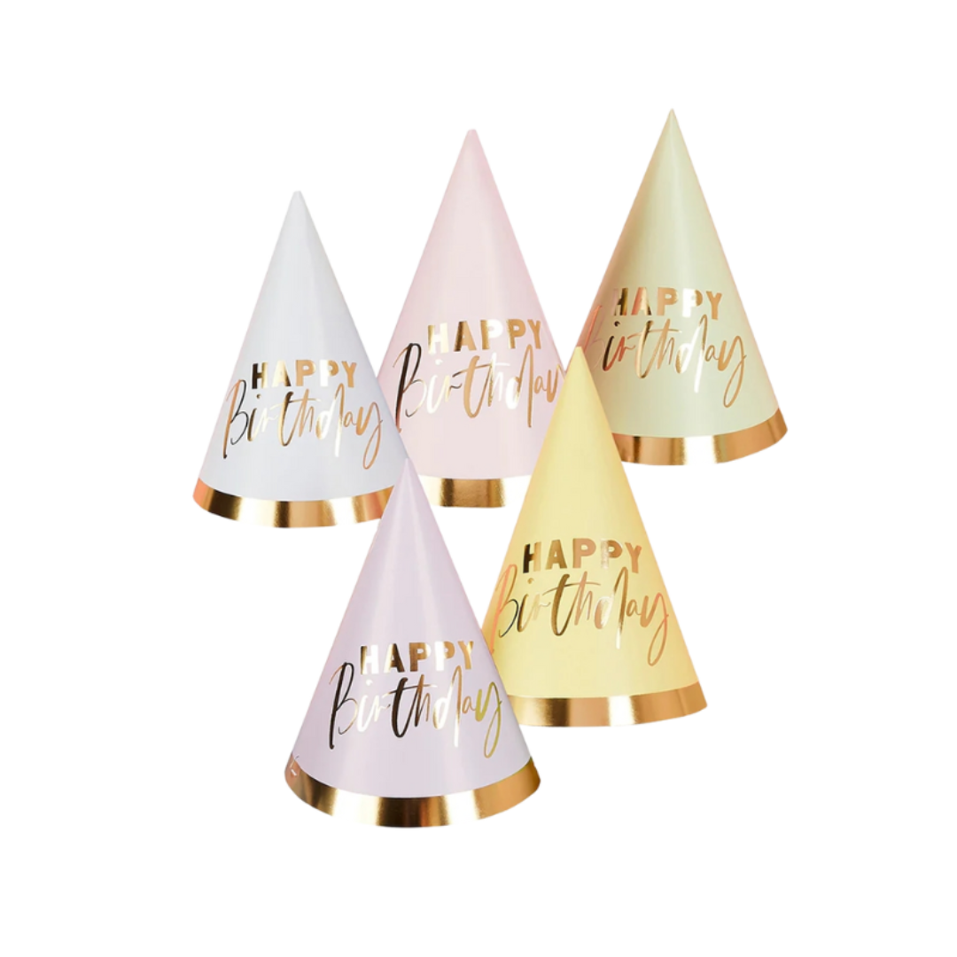 Is it even a party without adorable hats? Add a touch of elegance to your celebration with these "Happy Birthday" Pastel Party Hats - 10 pk! Featuring soft colors and a chic metallic gold trim, these hats bring a stylish flair to any birthday event