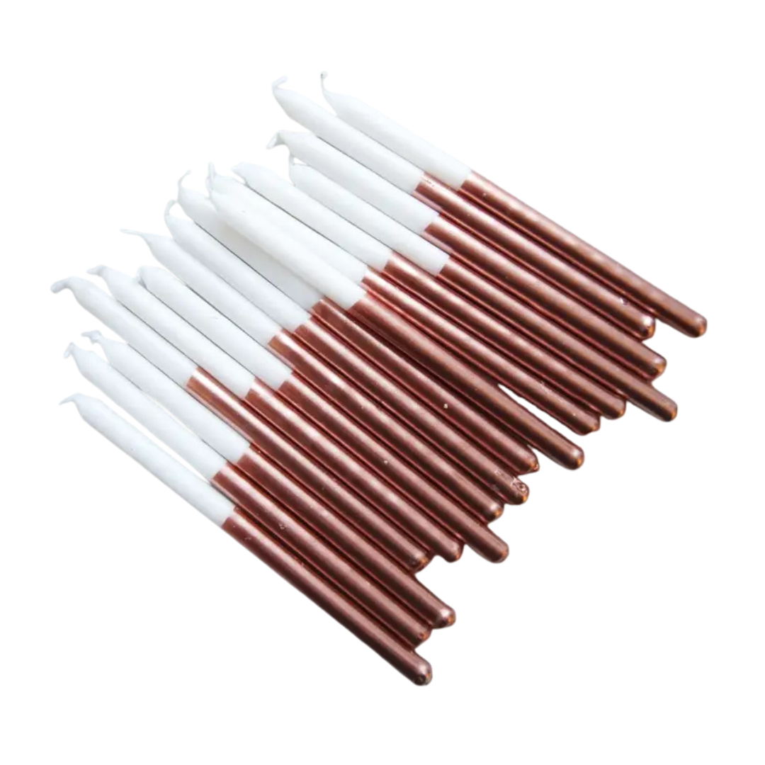 Illuminate your event with our Bronze Metallic Dip Candle Set - 16 pk, designed to bring a touch of glamour and sophistication to your party. Featuring a stylish bronze metallic base and classic white tops, these candles bring a sophisticated elegance to any celebration.