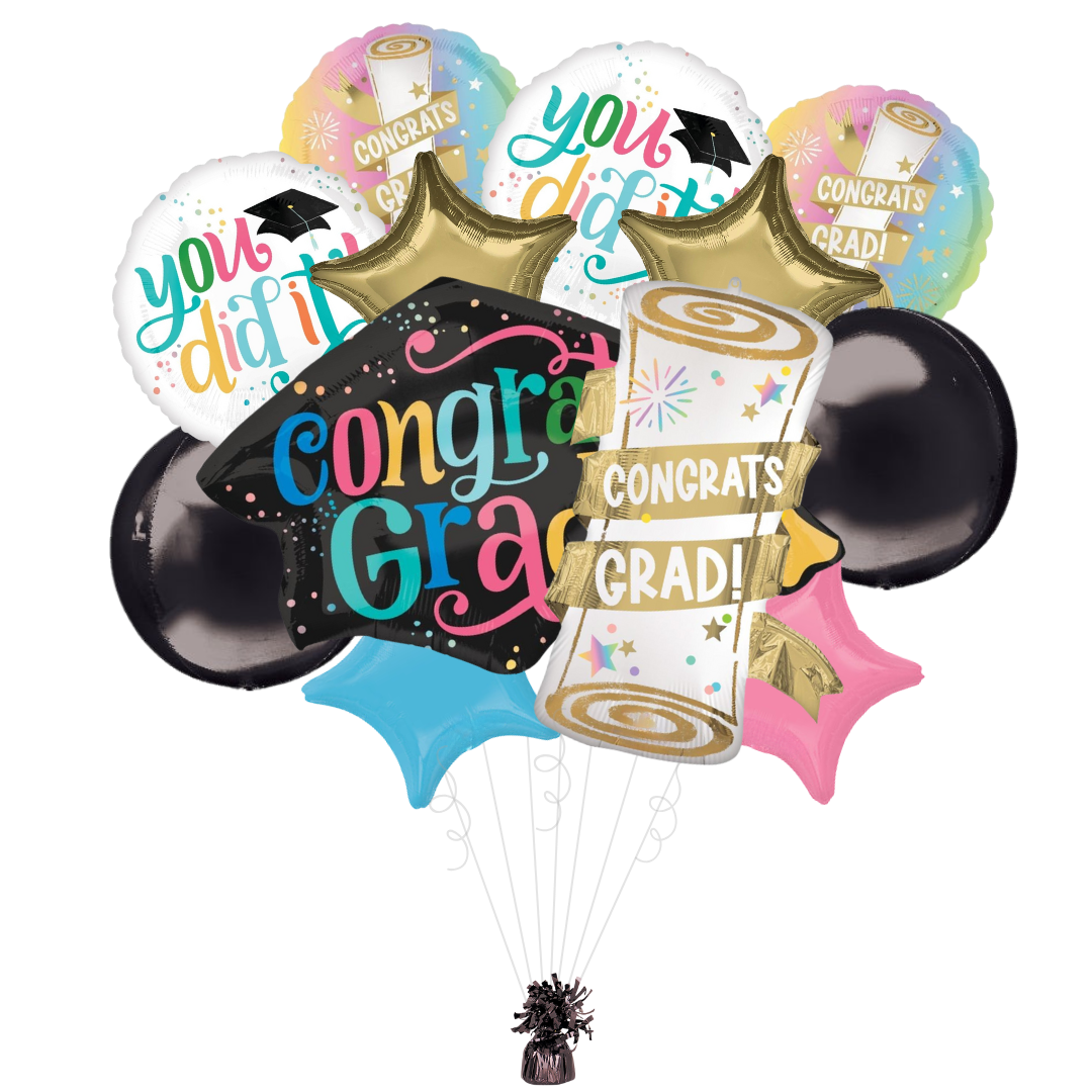 Celebrate your graduate’s achievement with this vibrant and cheerful "Congrats Grad" and "You Did It" Foil Balloon Bundle! With bold colors, playful designs, and a fun graduation theme, it’s the perfect way to make their special day even more memorable.