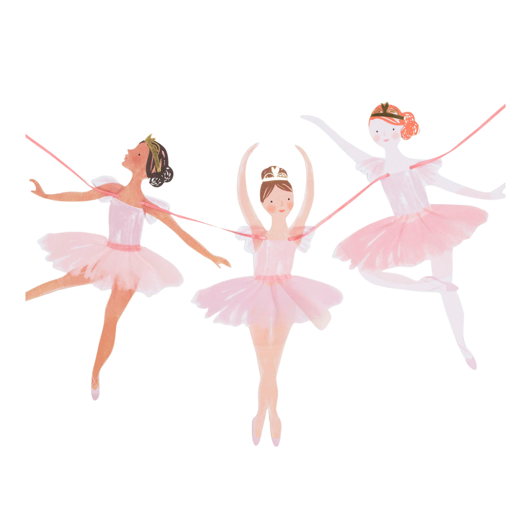 Hang this stunning Pink Ballerina Themed Party Garland at your ballet themed birthday party, or use it as decor in your little girl's bedroom! It hangs on a dusty pink ribbon, and features lovely dancing ballerinas with pretty tulle tutus. A must have ballerina themed birthday party decoration!