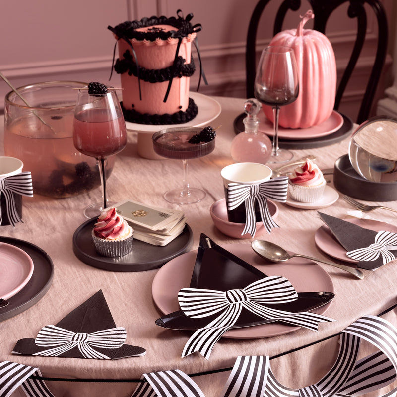 The witching hour is here again, so thrill your little coven with an elegant, eerily decorated Halloween party. These Black Witch Hat Dinner Napkins, adorned with chic striped bows, will add spellbinding flair to your table.