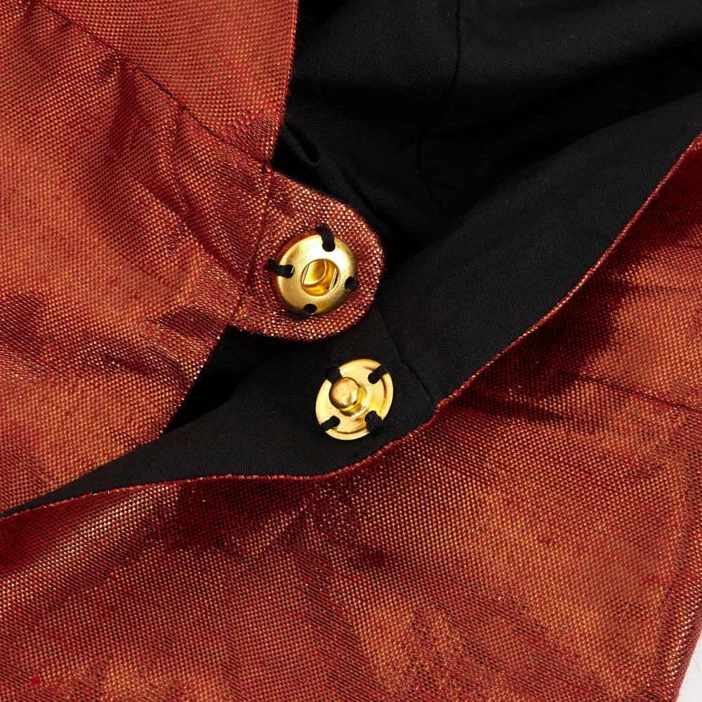 Little dino lovers will adore this Orange and Black Dinosaur Costume! It makes a fantastic gift and and an excellent addition to a dress up box. The hooded jacket is crafted from red and copper lame. It has felt facial details and spikes sewn on the back. Perfect for lots of roaring good fun!