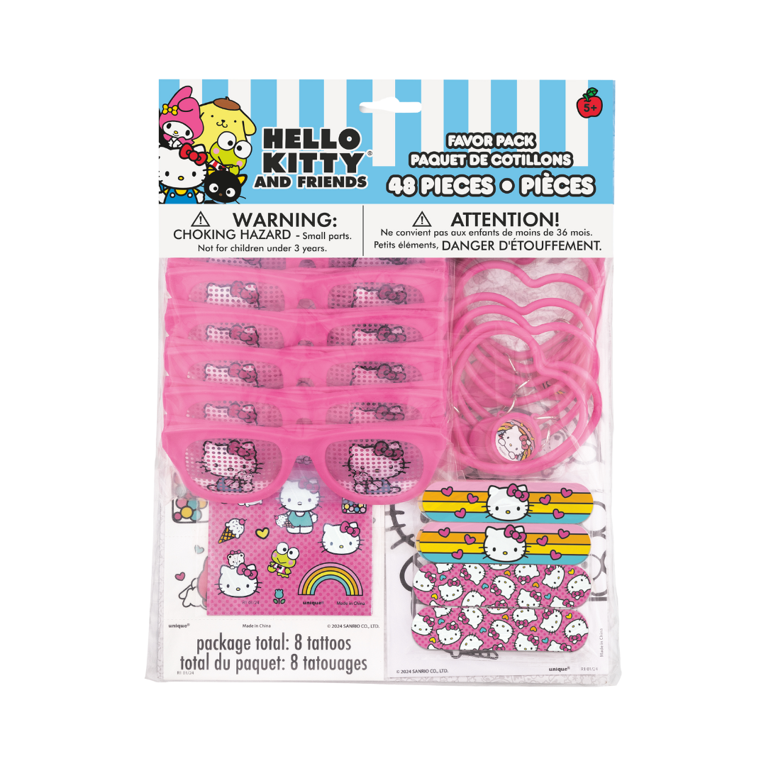 Make party planning a breeze with this adorable Pink Hello Kitty Favor Pack! Featuring 48 colorful pieces, it includes themed glasses, bracelets, tattoos, activity sheets, and stickers, perfect for filling goody bags or setting up a favor table. Packed with charm and fun, this all in one kit will delight your guests and make your Hello Kitty party unforgettable!