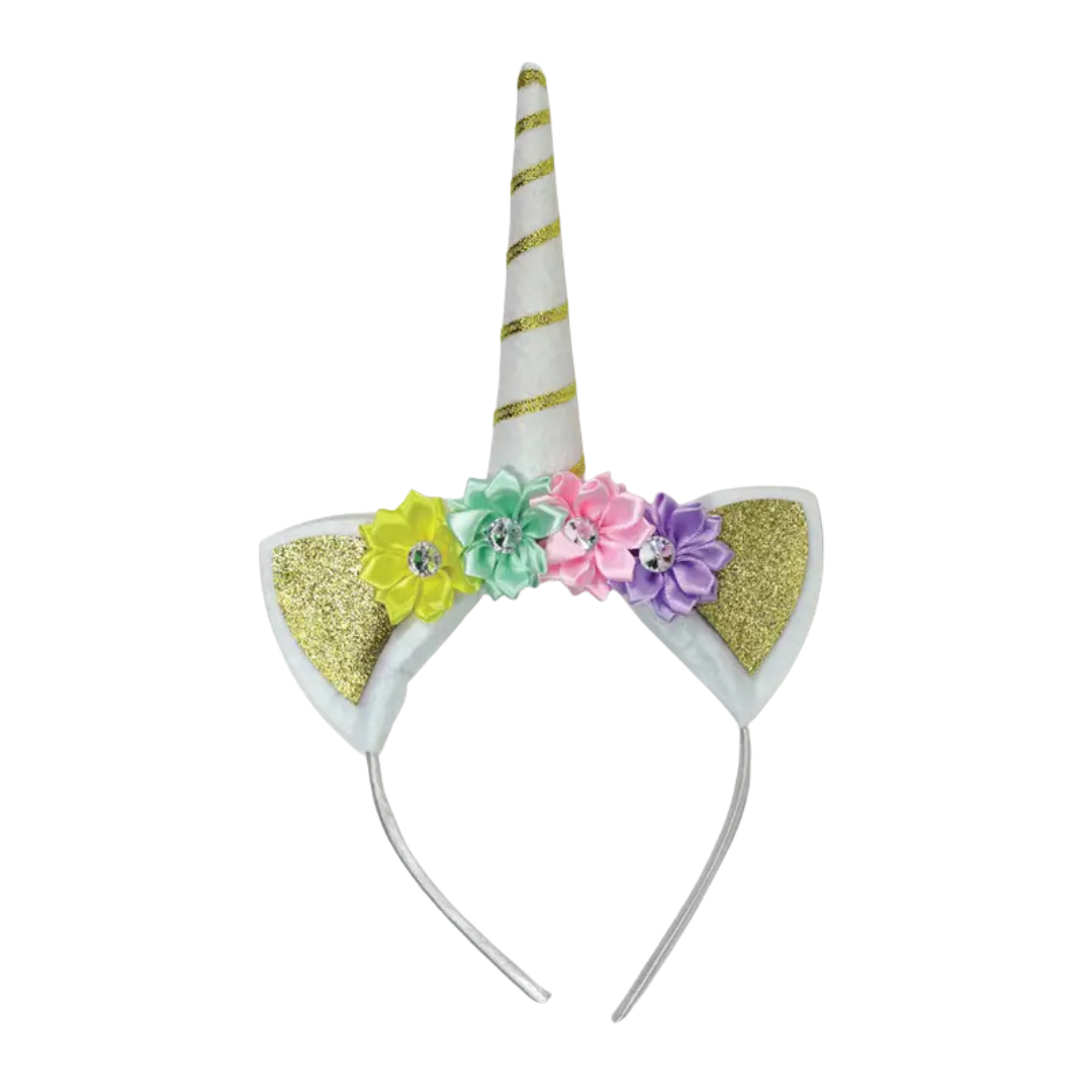 Bring a touch of magic to any celebration with the White and Gold Unicorn Headband! Featuring a shimmering gold glitter horn wrapped in delicate gold thread, sparkling ears, and a crown of pastel flowers with gem centers, this whimsical accessory is pure enchantment. Perfect for birthdays, dress-up days, or unicorn-themed parties, it turns every moment into something truly magical.