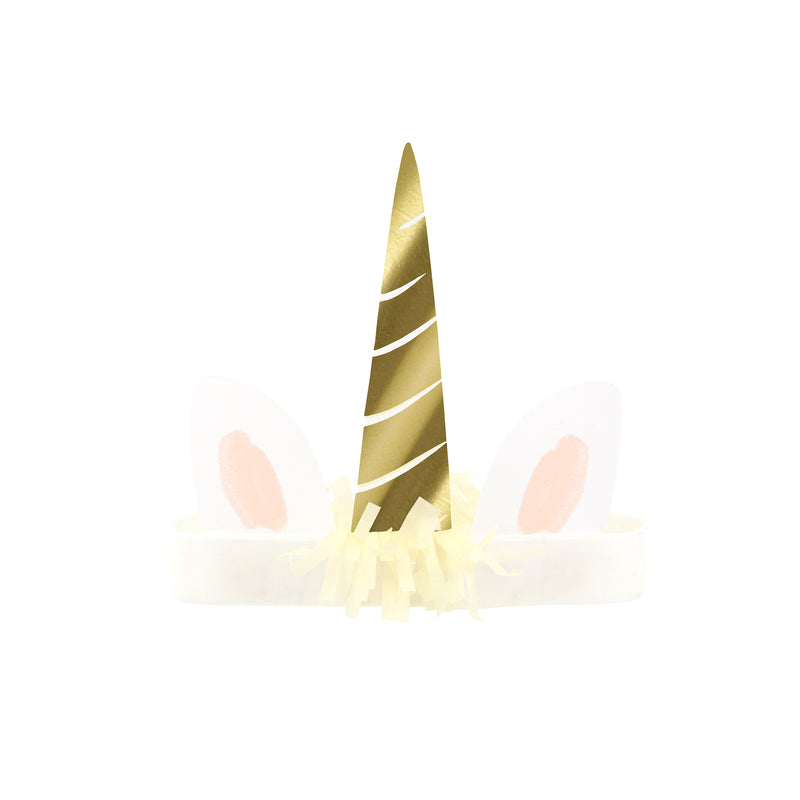 Transform your guests into unicorns with these Pastel Meadow Unicorns Horn Headbands. A delightful and luxurious alternative to a conventional party hat! The clever combination of a shiny gold foil horn, paper ears, a tissue paper fringed mane, and a soft velvet elastic, gives a super fun look. The pastel colors will add a stylish decoration to your unicorn party table too.