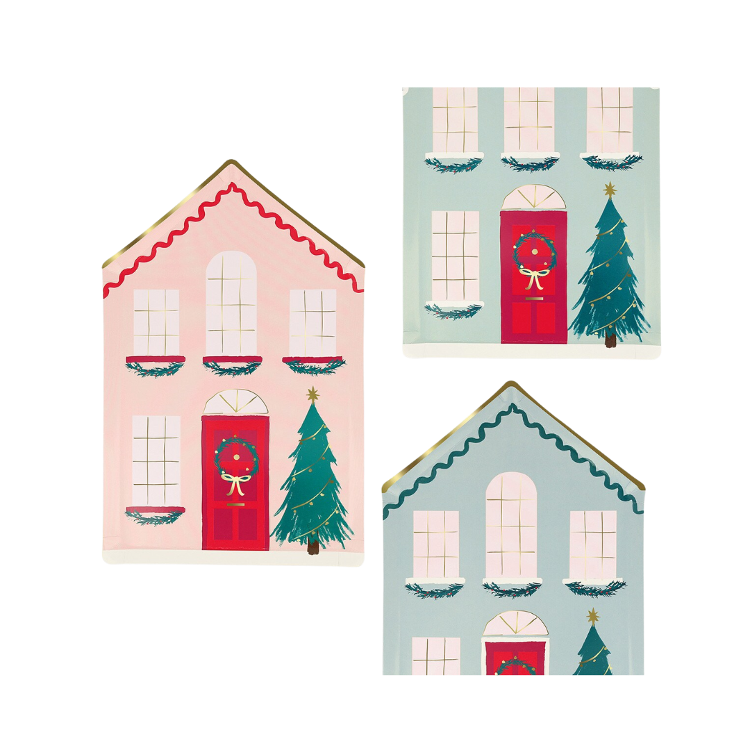 These Green and Pink Festive Holiday House Shaped Large Dinner Plates feature traditional wintry houses where you just know the families inside are celebrating Christmas in style! Fun ric rac roof details team beautifully with shiny Christmas wreaths, and decorated trees and windowsills. Perfect to add a touch of instant nostalgia to your festive meals and parties.