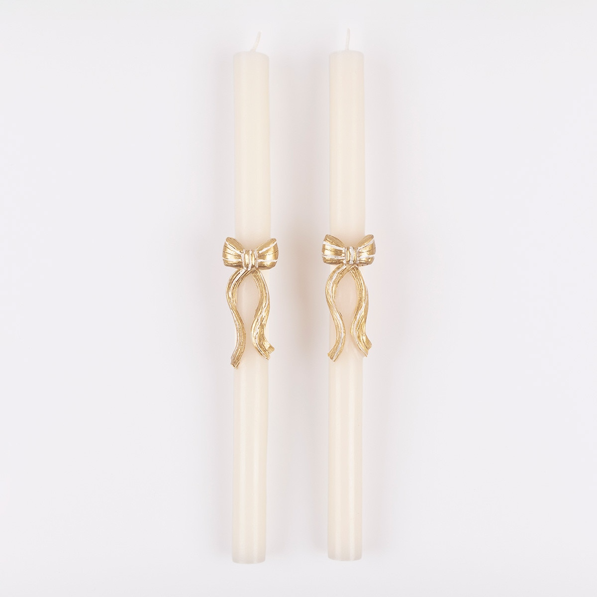 Bows are the ultimate festive style statement! So, we've embellished these Gold Stripy Bow Table Candles with these chic touches for a striking effect. The gold and white stripes will add a sophisticated look to any Christmas celebration. Perfect for your dinner table, styling your mantel, or gifting to your favorite host.