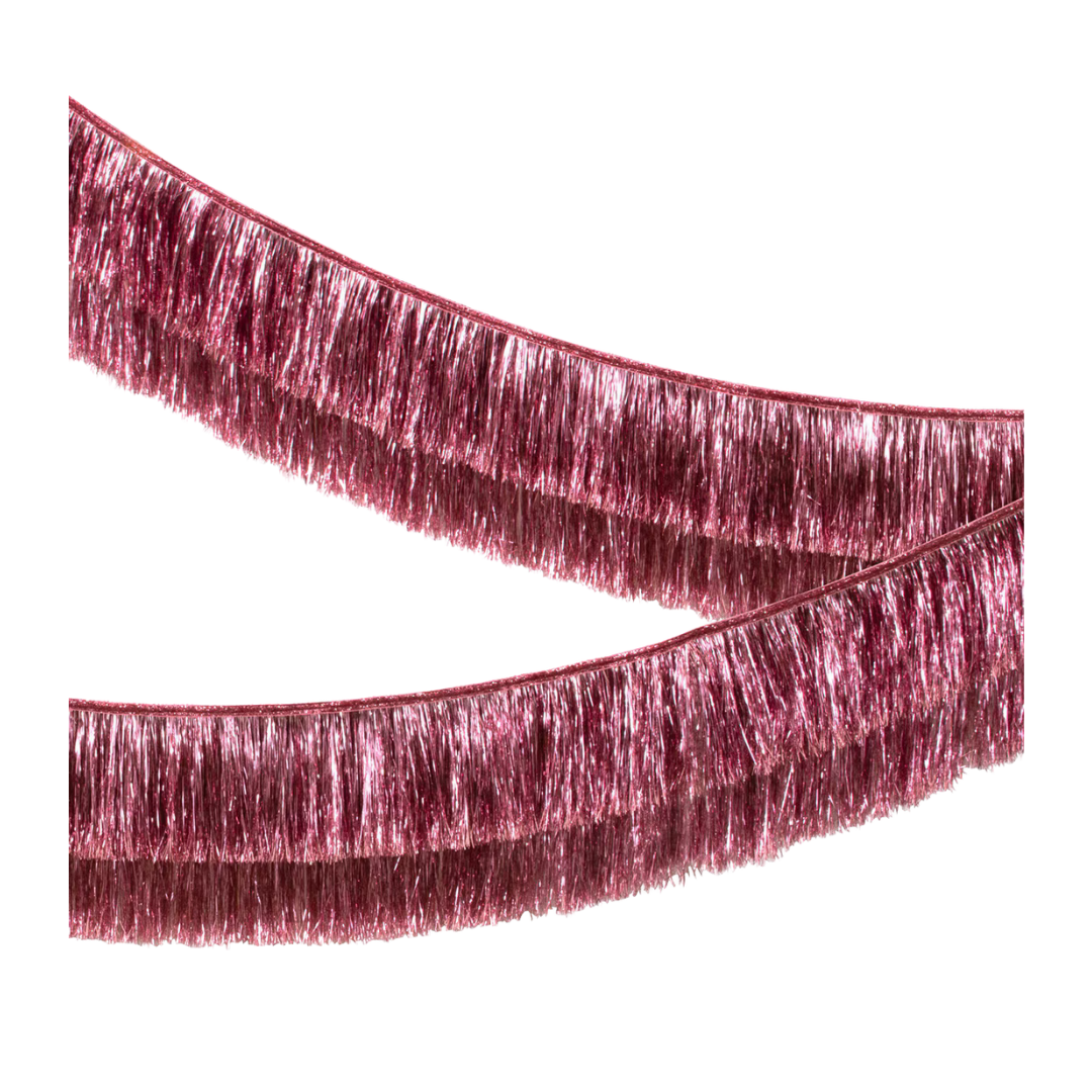 Bring a touch of shimmer and style to your celebration with this Pink Tinsel Fringe Garland! Designed with two layers of metallic pink fringe, this garland adds dimension and sparkle to any party space. Perfect for birthdays, bachelorette parties, baby showers, or any event that calls for a hint of glam.