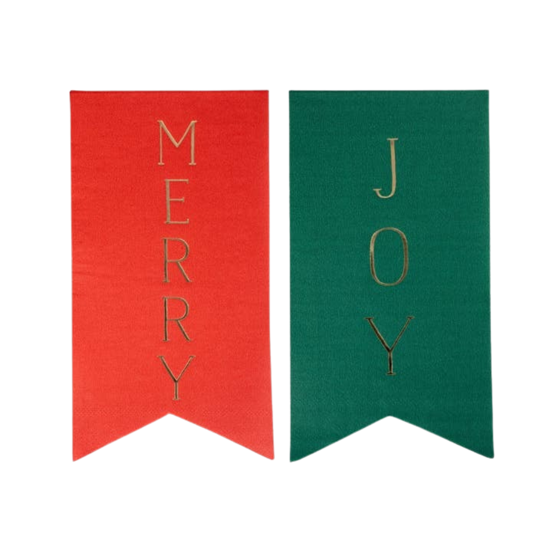 Add festive elegance to your holiday table with these Red and Green with Gold Pennants Merry + Joy Christmas Dinner Napkins featuring gold foil lettering that reads “MERRY” and “JOY.” Perfect for Christmas dinners, parties, or holiday gatherings, these napkins bring a stylish touch of cheer to every place setting.