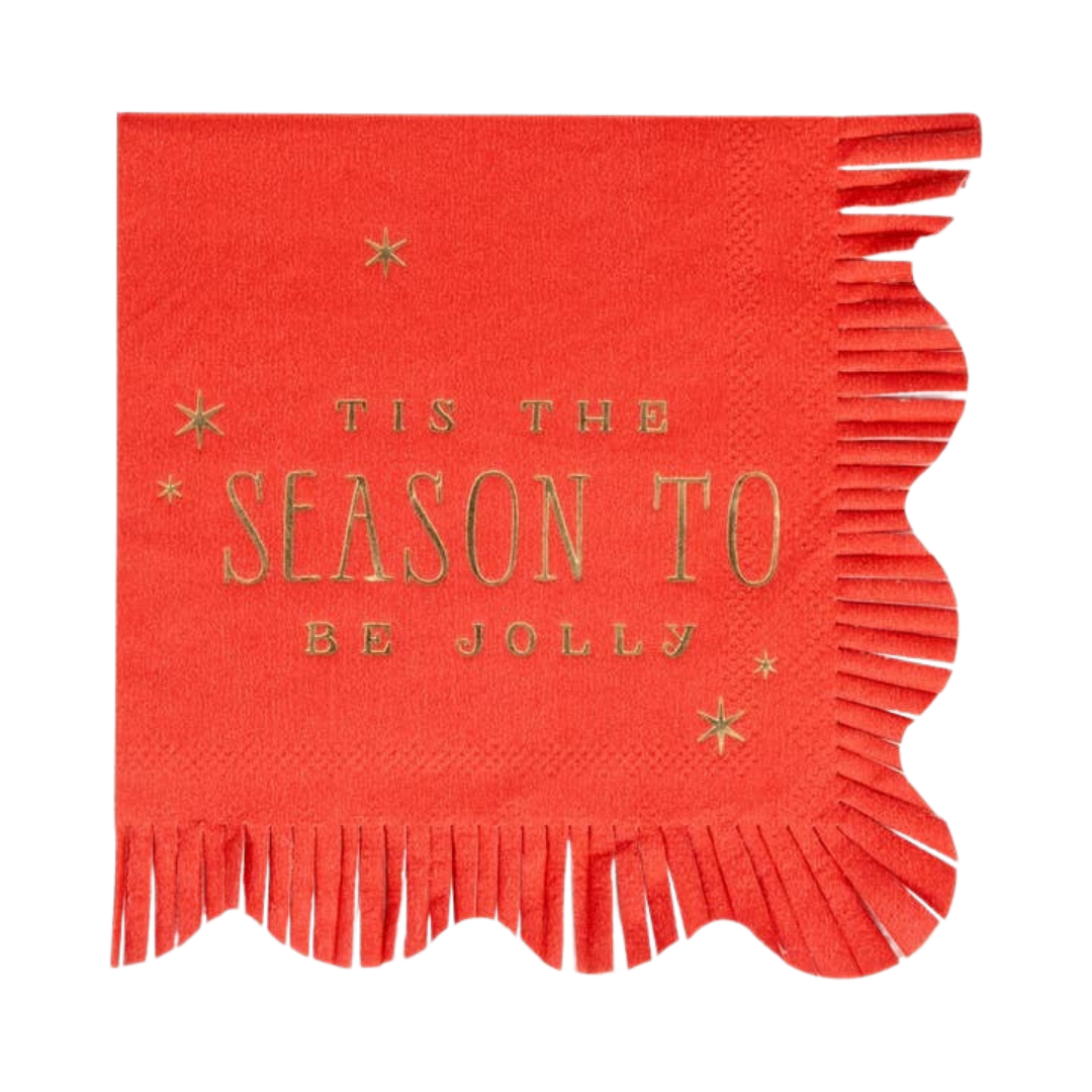 Celebrate in festive style with these Red with Gold Fringed "Tis the Season To Be Jolly" Christmas Cocktail Napkins. Featuring elegant gold foil lettering and charming fringed edges.