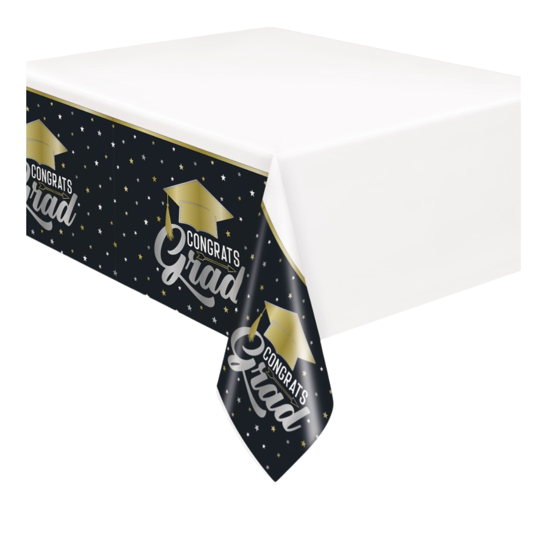 Set the stage for your celebration with this stylish Black "Congrats Grad" Table Cover! Featuring a bold black background with a gold graduation cap, silver and gold stars, and a large "Congrats Grad" message, this tablecover instantly transforms any table into a festive centerpiece. It's perfect for protecting surfaces while adding a polished look to your grad party setup.