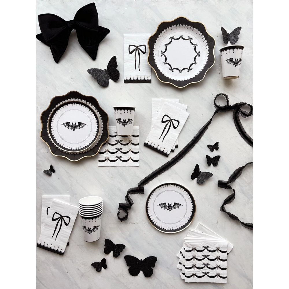 Impress your guests and elevate your Halloween tablescape with our White & Black Elegant Halloween Guest Napkins! These all make the perfect addition to a till death do us part bachelorette party. Featuring a chic black bow design and luxurious gold foil details, these towels are perfect for adding a touch of spooky elegance to any Haunted House dinner party or powder room.