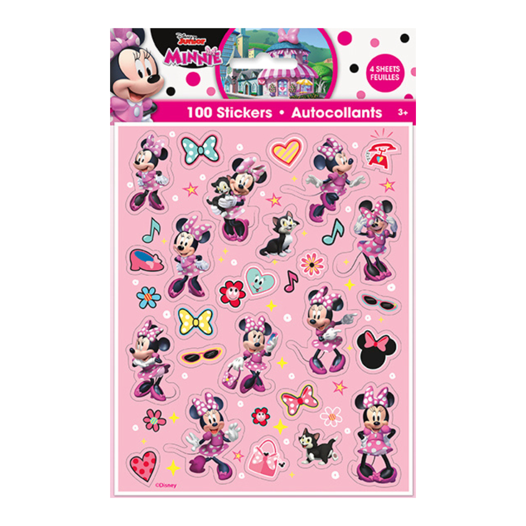 Bring Minnie Mouse magic to your party with these Minnie Mouse Sticker Sheets - 100 pcs! Each pack includes 4 sheets with a total of 100 stickers featuring Minnie in various fun poses, along with bows, hearts, music notes, and more. Perfect for party favors, crafts, or decorating invitations and gift bags.
