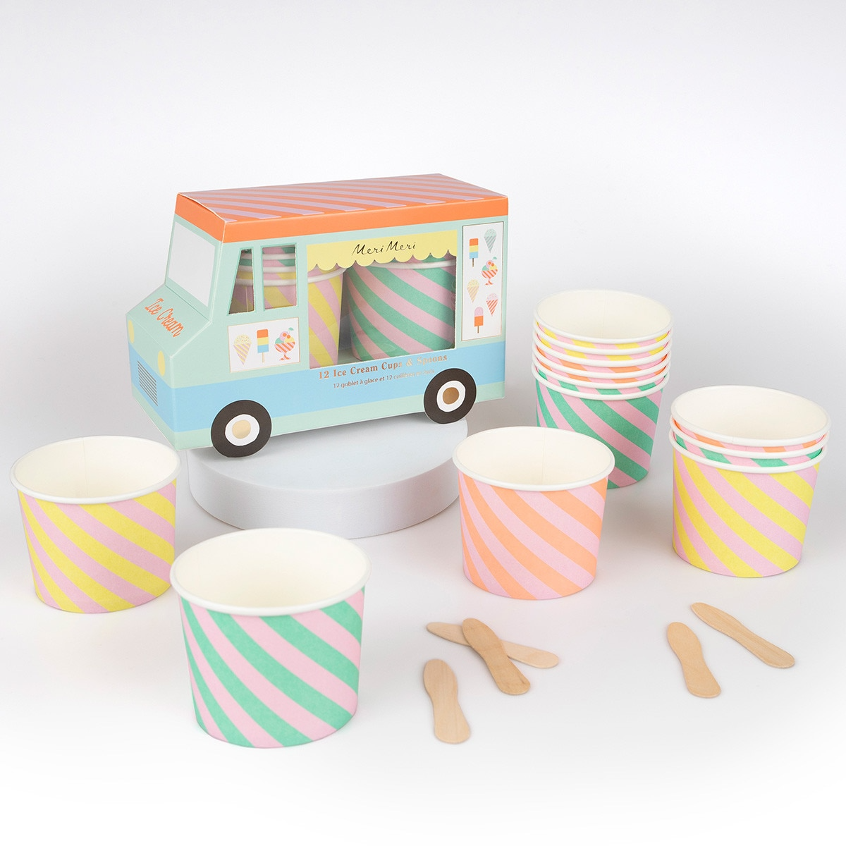 Hurrah, it's ice cream time! Serve up sweet summer fun with this Pastel Ice Cream Cups and Spoon Set, filled with 12 striped cups and 12 wooden spoons. Perfect for birthdays, BBQs, beach days, school holidays, or retro carnival parties, it also doubles as a playful party centerpiece.