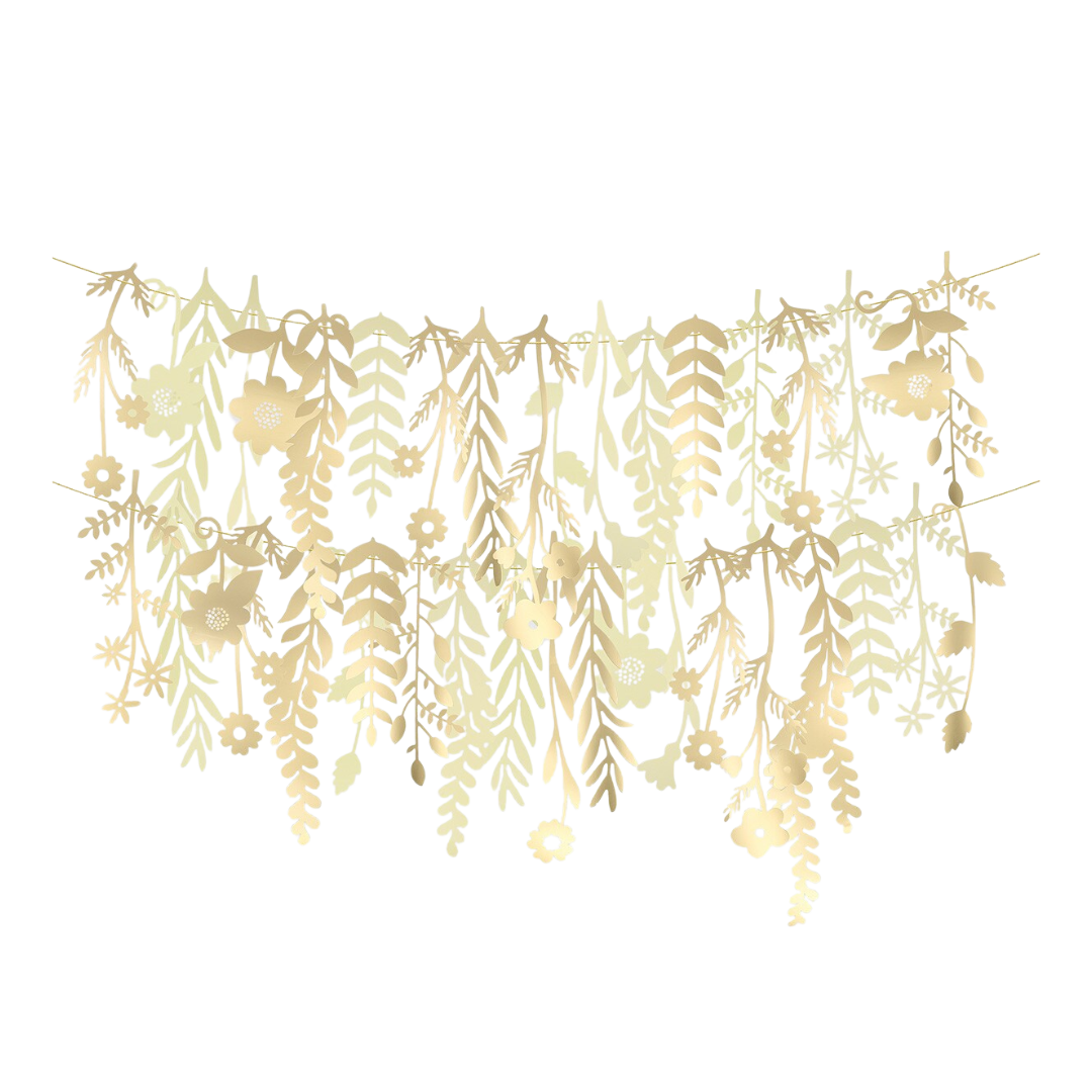 Add an elegant touch to any celebration with this stunning Gold Flower Backdrop Set. Featuring 2 rows of intricately cut flowers and foliage in matte gold foil, it’s perfect for bridal showers, golden anniversaries, birthdays, or as a photo backdrop at any special event. The high-quality paper florals hook onto two included metallic gold cords, making setup simple and stylish.
