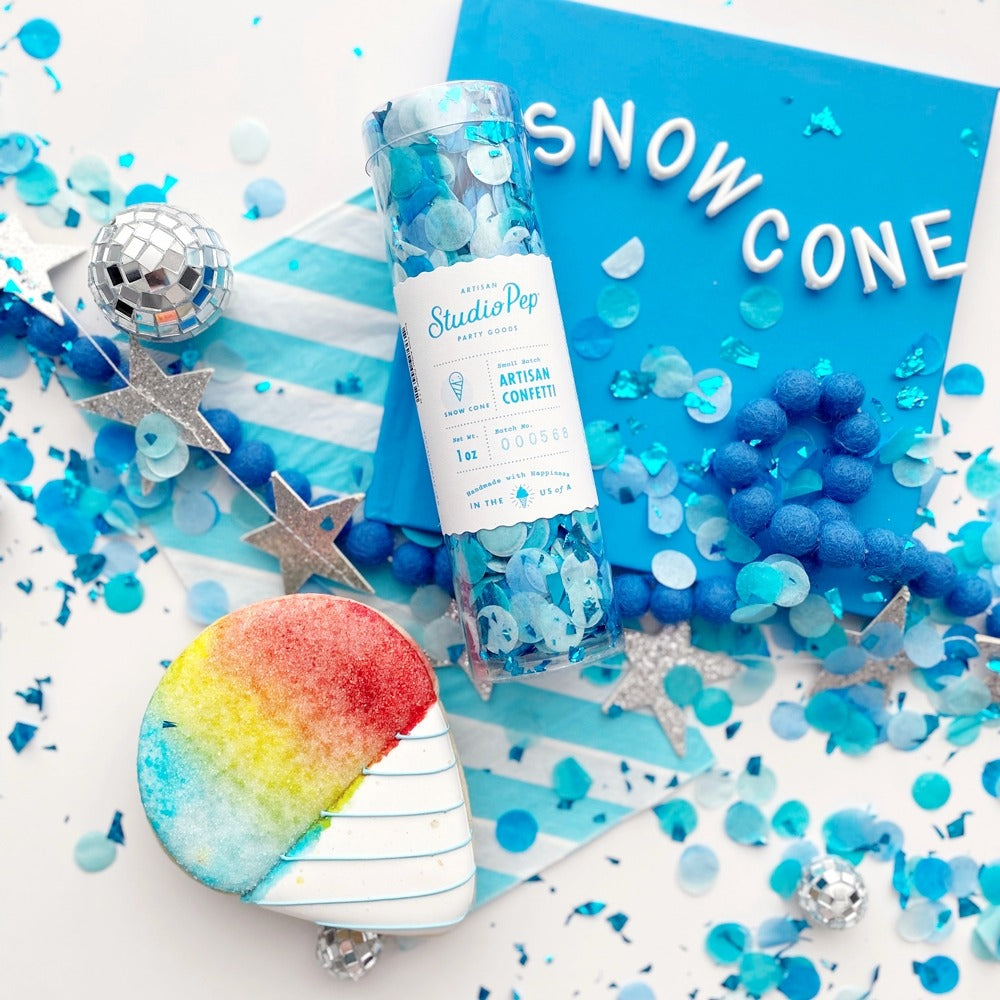Cool off your celebration with this Blue Snow Cone Artisan Confetti Party Popper - Mini Pack! Featuring an icy blend of vibrant blue hues and shimmering foil accents, this handcrafted confetti brings a refreshing and fun touch to any event. Perfect for summer parties, carnival themed celebrations, birthdays, or any occasion that calls for a frosty pop of color, this small batch confetti is made in the USA with love.